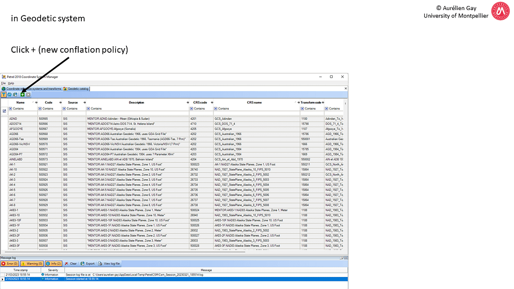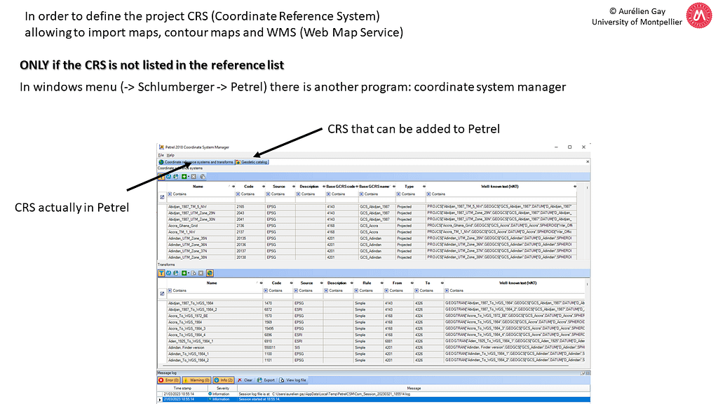 Petrel has a lot of CRS (Coordinate Reference System) embedded in the main program. However, if your CRS is not listed, you must use a companion program called « Coordinate System Manager ». This program is in the windows menu -> Schlumberger – Petrel