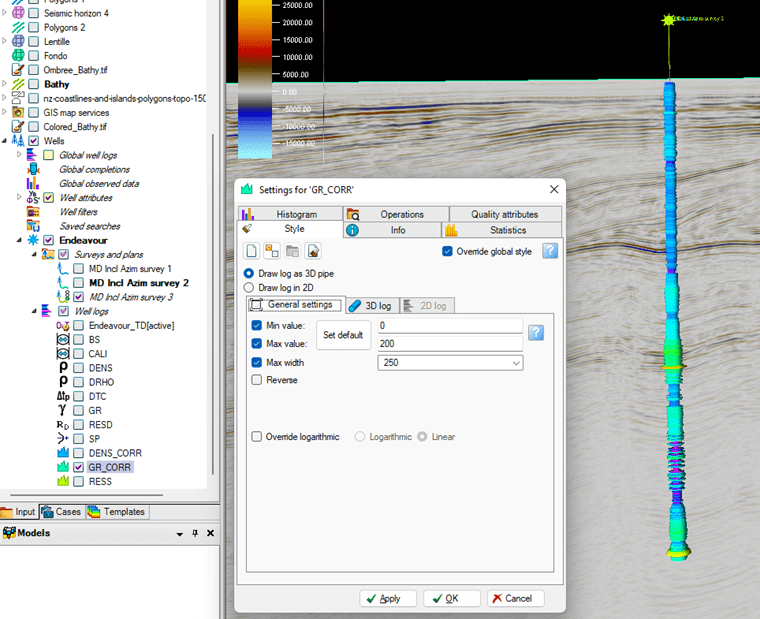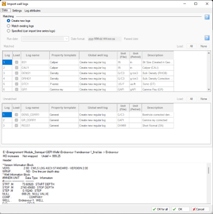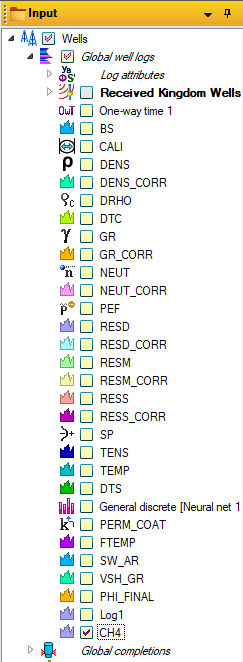 However, as you have selected create new log when importing, a new attribute has been added the « Global Well Log » attribute. In the left pane, just go to the top and expand Global Well Log, it should look like: