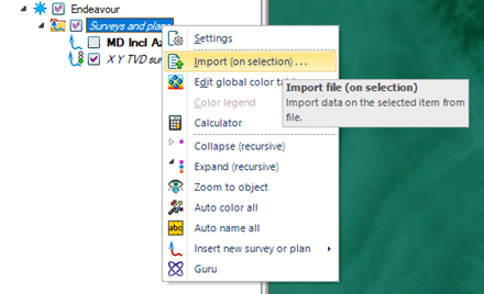 A new well is created. Here it’s called Endeavour. At this stage, the well is empty and can only be displayed in map view. Right click on « survey and plans » and click on « import (on selection).