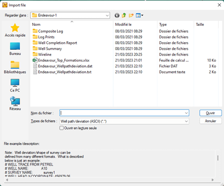 The extension is « well path deviation » and select the appropriate file containing informations. Please remember that this step is requested only if the well is deviated.
