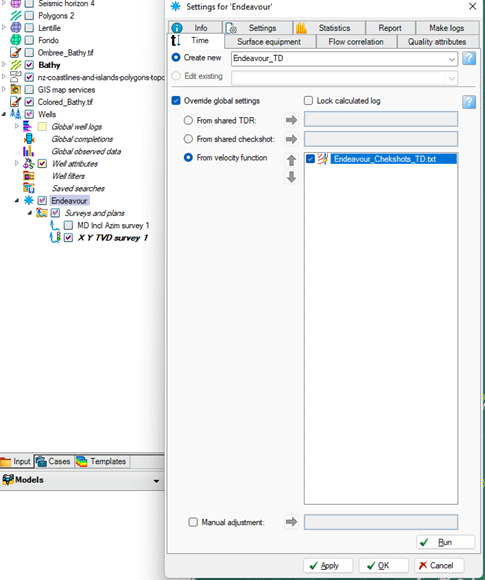 Now, you must apply the Time-Depth conversion (it’s not automatic). Right click on the well name in the left pane and click on settings. In the « time » tab, create new TD Chart: provide a new name. As your well has its own TD chart, slect « override global settings » and « from velocity function » and tick the box corresponding to the TD-Chart file. Then click « RUN ».