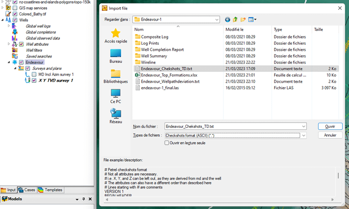 Once done, you right click on the well name in the left pane and click again on « import (on selection). Select the checkshot format extension and click on the ascii file containing the TD chart.
