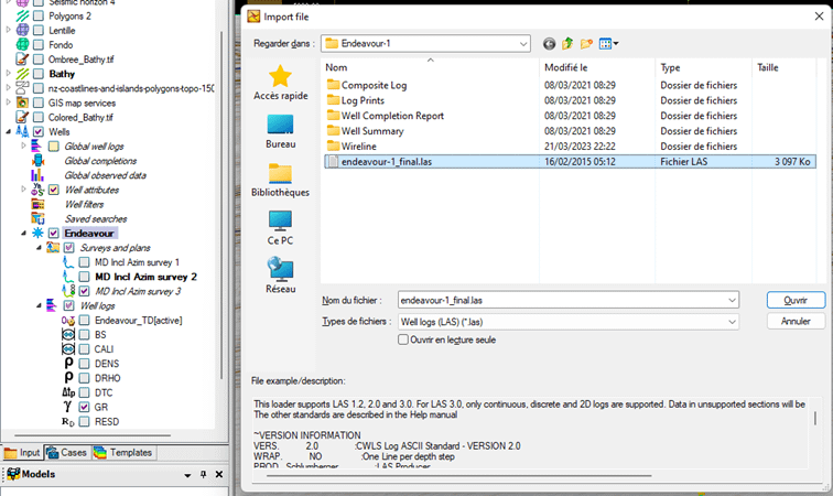 You need now to import data. In the left pane, right click on the well name and select « import (on selection ». Depending on your data, select the right extension. Here it’s with LAS files.
