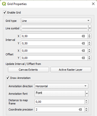 In the window that opens, just select what you want, for instance a line every 1° or every 30′, depending on your own preferences.