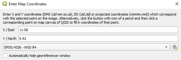 Add coordinates in the window that pops up. In this example, coordinates are in degrees/minutes. You need to transform in decimal degrees. It means that 11°5′ = 11,08. A simple way is to do minutes/60*100 = decimals. Here it is 5/60*100=0.08 so the result is 11.08