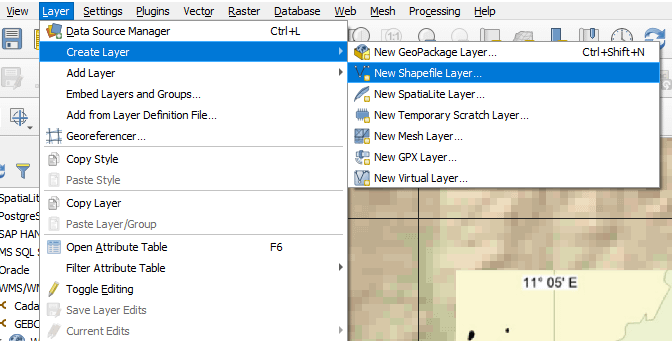 Then, you can add layers to redraw the location of red triangles. In the top menu, click on Layer -> Create Layer -> New Shapefile Layer