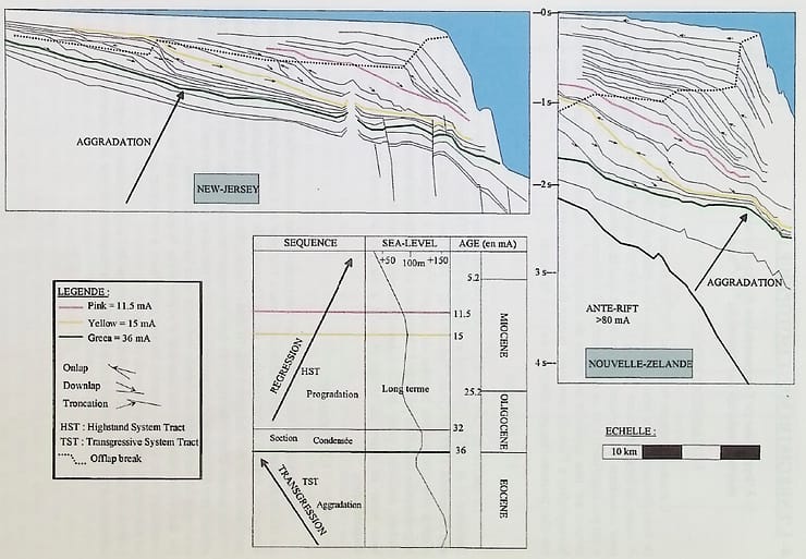 Based on seismic stratigraphy, we were able to describe a major change in the architecture of basins at Oligocene. This could be explained by a drastic change in climatic conditions on Earth, from a greenhouse period (no polar caps) to a icehouse period (fast alternating glaciations and interglacial periods). These new conditions may have increased erosion and weathering on lands and huge amounts of clastic materials were transported to basins.