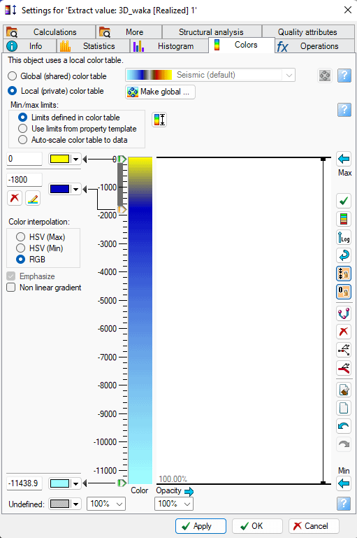 Once done, you must check the range values of your RMS block by viewing values in settings -> colors. Here it’s from 0 to 13620. So, right-click on the newly created surface, click settings and in the color menu, change the values as previously described.