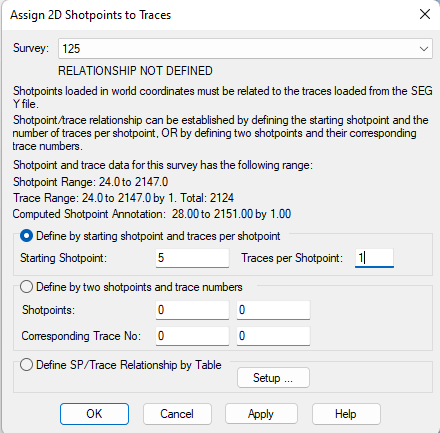 In the last window, kingdom asks you to define a relationship. Again, check in SeismicExplore. The first line having X and Y locations is line 5 corresponding to Shotpoint 5 and CDP number 28. So, set the strating shotpoint to 5 and take a look at the increasing number: the following line is shotpoint 6 with a CDP number of 29, meaning that there is 1 Trace per Shotpoint. Then click ok.