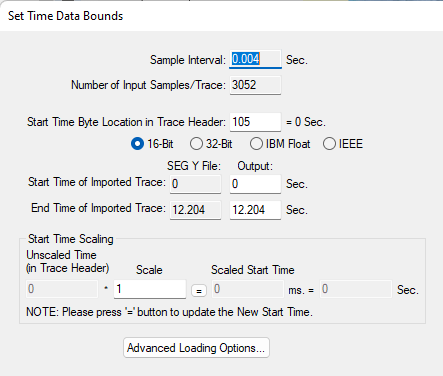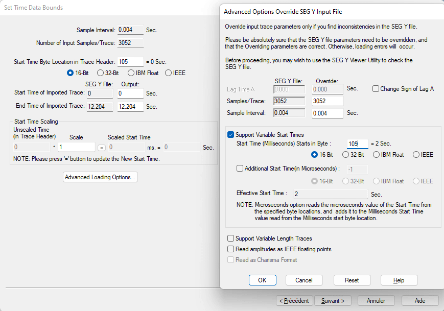 tick « Support Variable Start Times » and check in seismic explore bytes 105 to 109