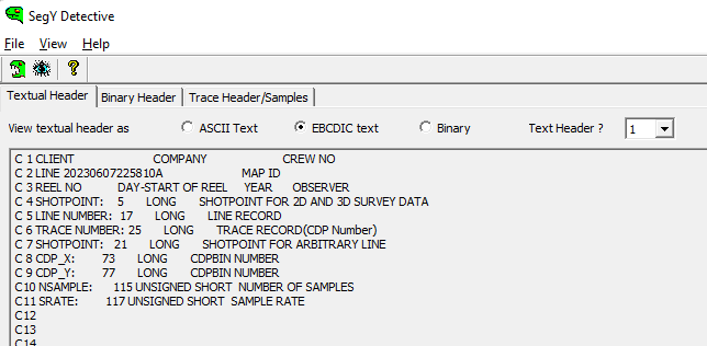 In segy detective, open the segy file. 3 menus are available. Textual header shows that XY coordinates are supposed to be at bytes 73 and 77 respectively.