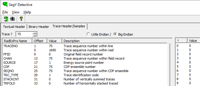 You must understand how segy files are organized. By default, Kingdom uses standard SEGY files and the shotpoint is set to 17. In our case here, it won’t work. So, check Segy Detective to identify what is the byte containing shotpoints. Use the arrows on top to increase the trace number. Here we are at Trace 76. You can see that the bytes 13, 21 and 25 contain the trace number. The byte 5 contains the shotpoint number.