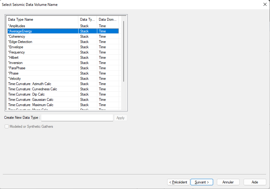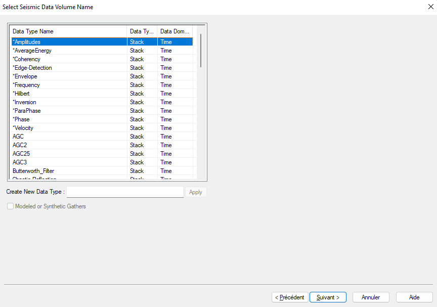 By default the data type is set to « Amplitude ». This is correct for classical seismic profiles, but you could choose or create « Energy » for Chirp profiles for instance. Click next