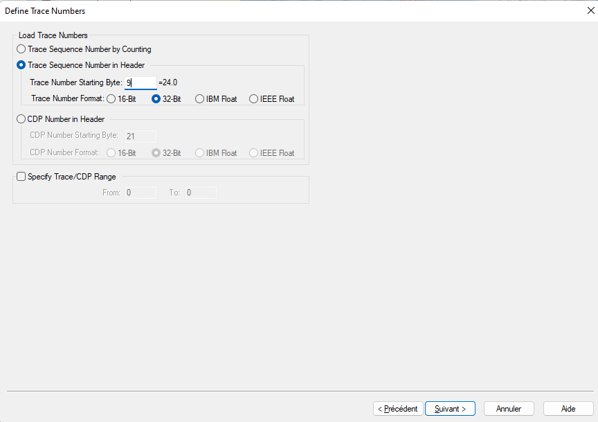 Select Trace Sequence Number in Header and select the appropriate byte number. This is a tricky part. To know the byte number, open either SeismicExplore (see how to set up it with kingdom in the installation manual) or use seiSee for instance.