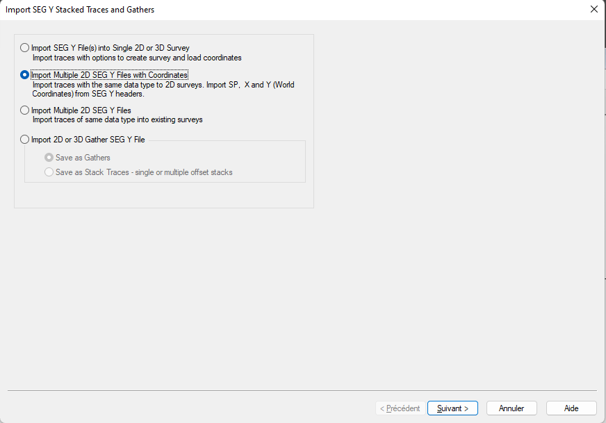 In the window that opens, select Import Multiple 2D SEG Y Files with Coordinates. Click Next.