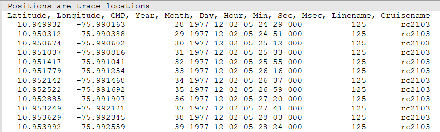 This file contains 12 columns and we need Lat, Long, CMP and Linename