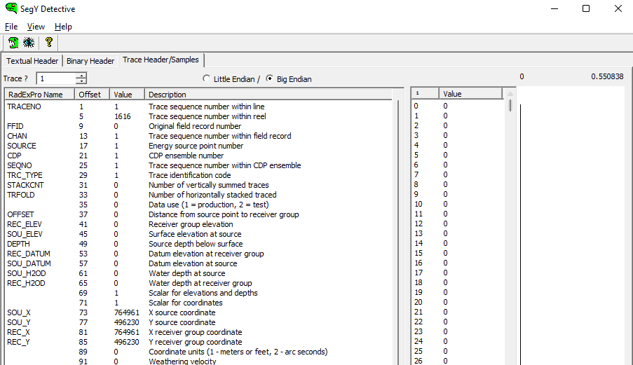 In the menu Trace Header/Samples, the bytes are displayed. Bytes 73 and 77 contain values. However, it doesn’t give you any info on the coordinate system.