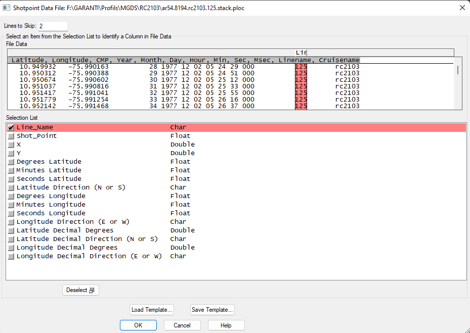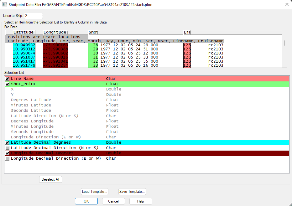 Do the same for other necessary columns such as CMP and location. In my case here, the location is in Lat/Long decimal degrees. WARNING: for CMP they can have great numbers, so expand the column to the left to better fit with large CMP numbers. If you have a large collection of seismic profiles with the same format, I suggest you create a template and you can load it each time you import nav file. Then click OK