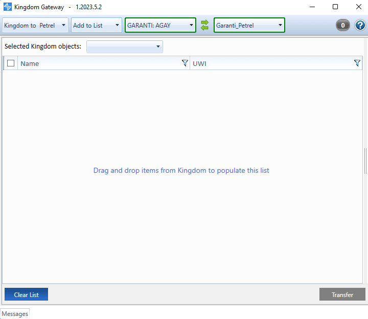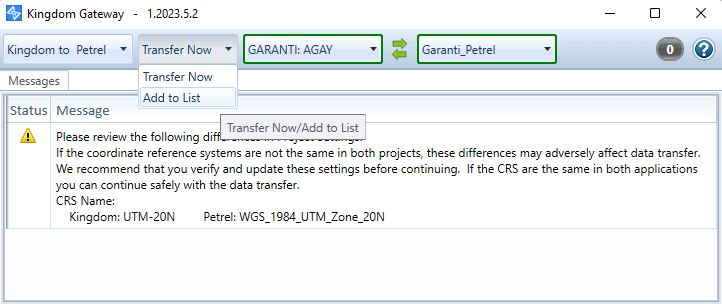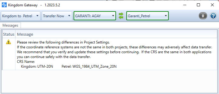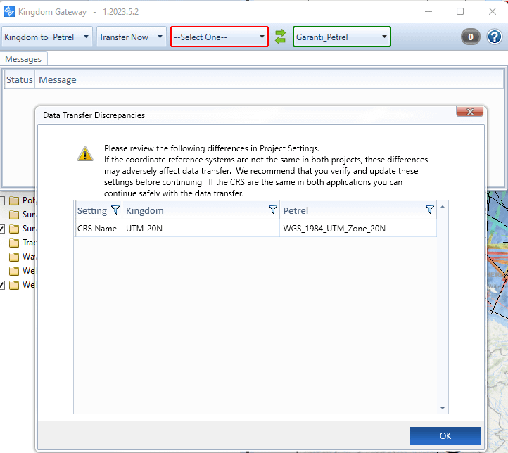 The gateway will open. It’s independant from Petrel and Kingdom. At this stage, you should have a pop-up window that opens because the coordinate systems in kingdom and petrel have different names. So, be sure both projects have the exact same coordinate system (the name can be different). If this is the case, just click ok.