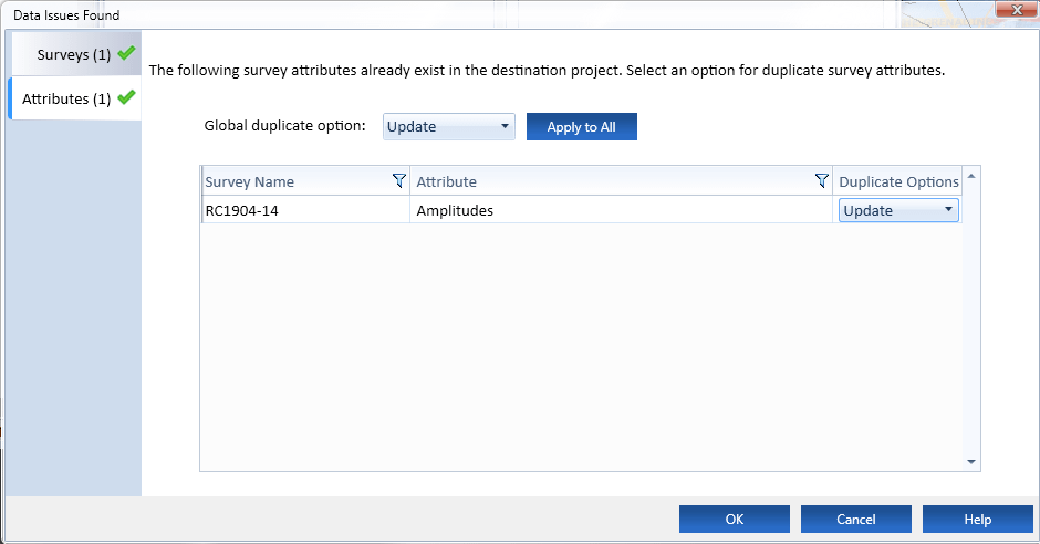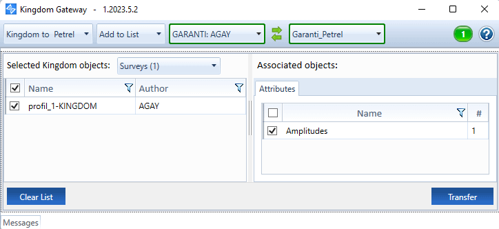 If the line already exists in your petrel project, choose an action (skip or update) for « Surveys » AND « Attributes ». A green tick appears once done. Then click ok and click « Transfer » button. WAIT !