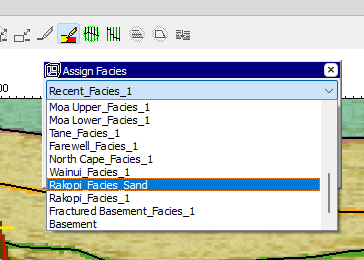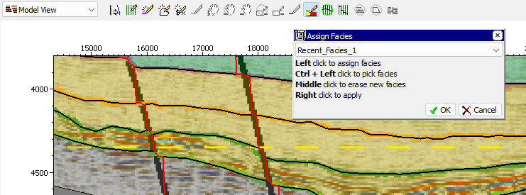 In the model view, click on « Assign facies » icon. A pop-up window will open. You are ready to digitalize the facies.